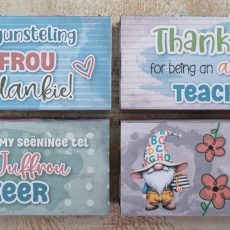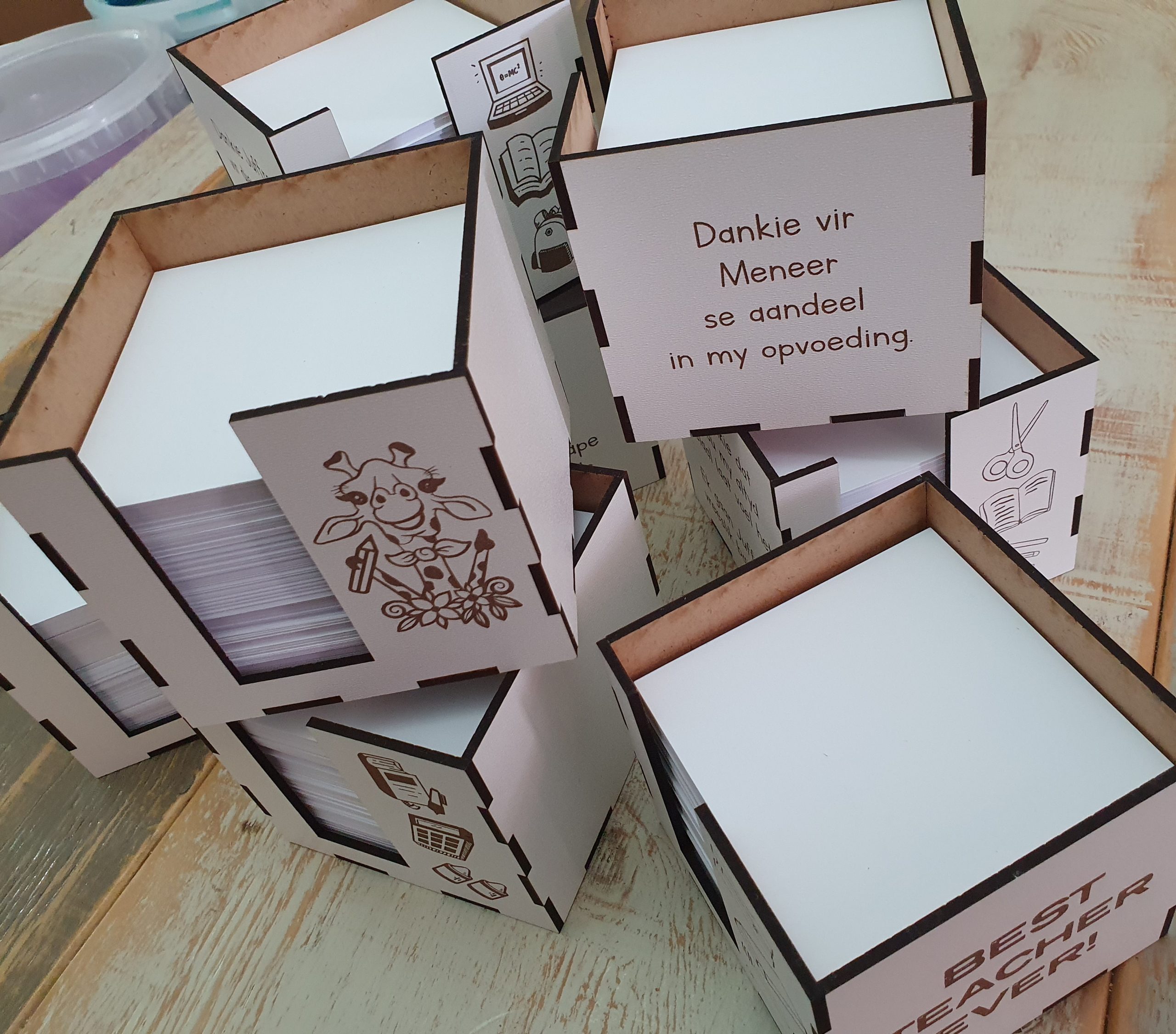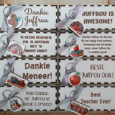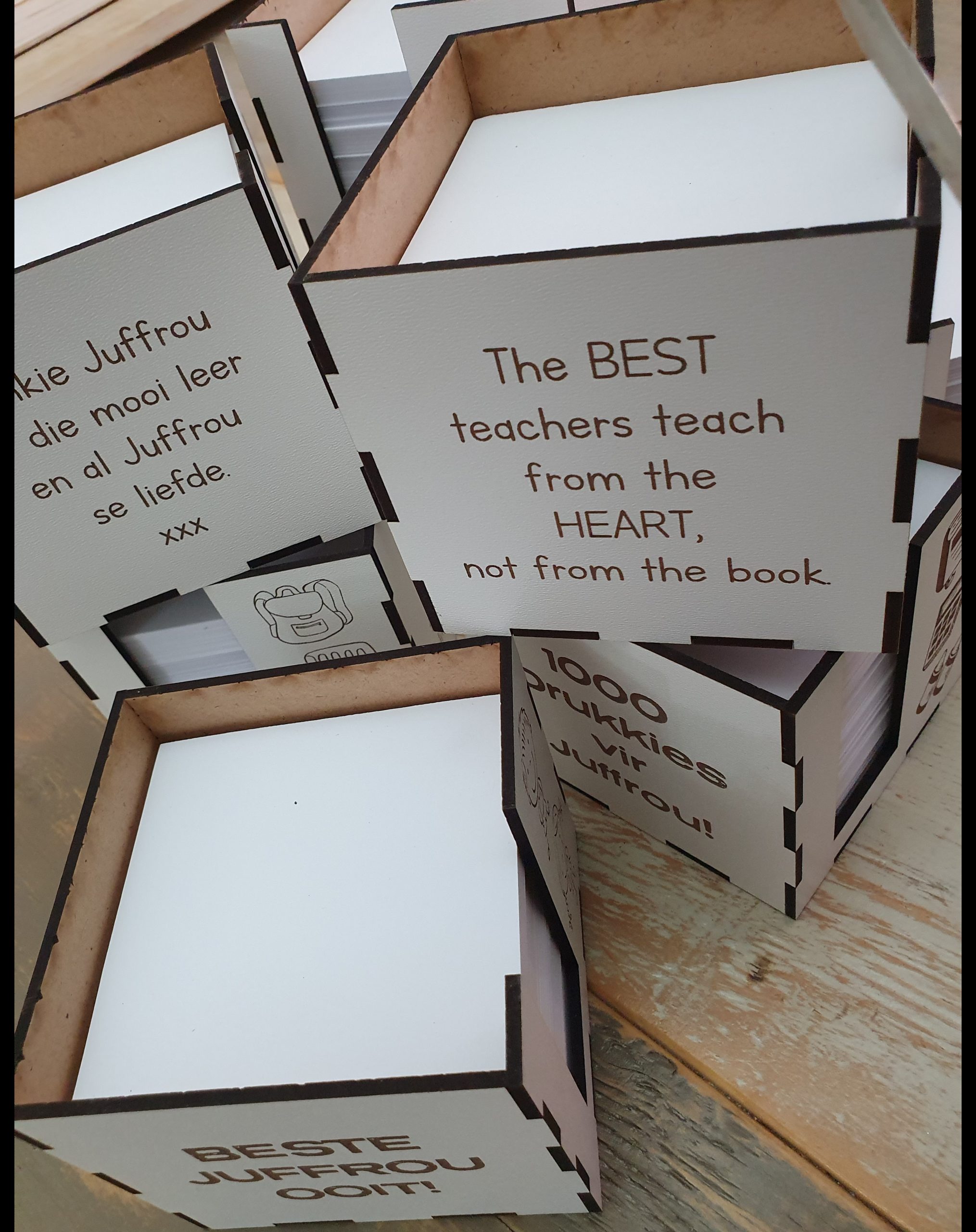 | Teacher note cube box | Baie dankie dat juffrou my altyd spesiaal laat voel het. Ek gaan juffrou vreeslik baie mis., Dankie juffrou vir die mooi leer en juffrou se liefde, It takes a big heart to help shape little minds, Beste juffrou ooit, Best teacher ever, The best teachers teach from the heart, not from the book, Dankie vir meneer se aandeel in my opvoeding, 1000 Drukkies vir juffrou, MIXED |